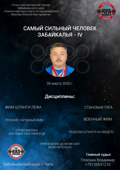 Открытый Мастерский турнир Забайкальского края по силовым видам спорта "САМЫЙ СИЛЬНЫЙ ЧЕЛОВЕК ЗАБАЙКАЛЬЯ - IV", памяти Мастера спорта по пауэрлифтингу Иванова Алексея Викторовича, 28 марта 2026 года, город Чита, Забайкальский край